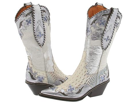 Cowboy boots refer to a specific style of riding boot, historically worn by cowboys. They have a Cuban heel, rounded to pointed toe, high shaft, and, traditionally, no lacing. Cowboy boots are normally made from cowhide leather but are also sometimes made from "exotic" skins such as alligator, snake, ostrich, lizard, eel, elephant, sting ray, elk, buffalo, and the like.There are two basic styles of cowboy boots, western (or classic), and roper. The classic style is distinguished by a tall boot shaft, going to at least mid-calf, with an angled "cowboy" heel, usually over one inch high. A slightly lower, still angled, "walking" heel is also common. Although western boots can be customized with a wide variety of toe shapes, the classic design is a narrowed, usually pointed, toe.